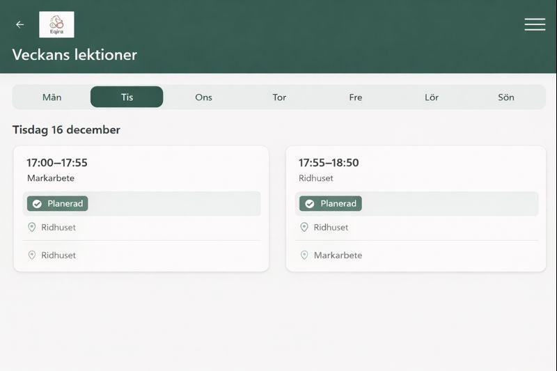 Eqira är det digitala verktyget som revolutionerar ridskoleverksamheten. Med fokus på att förenkla planering och administration samlar vi information om lektioner, grupper, hästar och kommunikation på ett och samma ställe. Vi strävar efter att ge instruktörer en enkel överblick och elever samt föräldrar tydlig information, så att ni kan fokusera på det som verkligen räknas – ridningen. Vårt system är anpassat för stallmiljön och utvecklat för att passa ridskolans verklighet, vilket gör vardagen lättare och mer strukturerad.